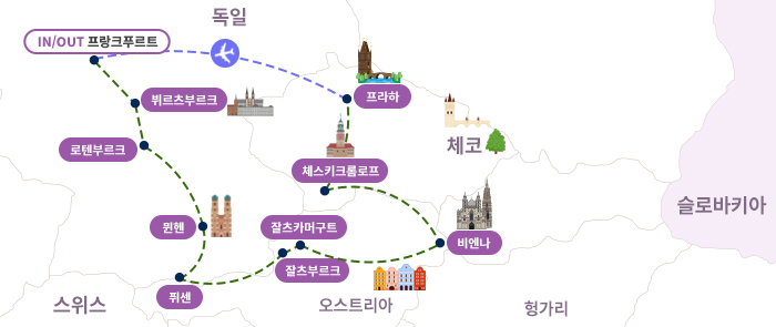 [항공] 독일 국적기 루프트한자 항공 비즈니스 좌석 탑승■ 좌석간의 넉넉한 거리와 비즈니스 클래스 승객에 맞는 맞춤 서비스 제공■ 공항 라운지 이용 가능 & 고급 기내식과 탁월한 서비스 제공※ 탑승 기재에 따라 상기 내용은 변동될 수 있습니다.※ 인천 - 프랑크푸르트 왕복 구간 직항편 비즈니스석 탑승※ 프라하-프랑크푸르트 구간 일반석 탑승※ 비즈니스 단체 항공권으로 출발 사전좌석 배정은 불가합니다. Miles & More 마일리지 적립■ 약 40개의 파트너 항공사 적립 가능, 좌석 승급, 루프트한자 월드샵에서 물품 구매 가능■ Miles & More 가입 바로가기 ☜ 클릭 시 이동[호텔]- 4성급 호텔 (★★★★) 3박 ~ 5성급 호텔(★★★★★)호텔 4박 숙박- 비엔나, 프라하 2박 연박으로 인한 편연한 여행!※ 현지 상황에 따라 변경될 수 있습니다.[식사] 독일&동유럽의 대표 전통식 및 특식 제공① 오스트리아의 대표 음식 : 호이리게, 슈니첼② 독일의 대표음식 슈바인학센 (독일식 족발요리)③ 체코의 대표 음식 : 보헤미안립스, 스비치코바[관광지] 독일&체코&오스트리아 지역별 차별화된 관광■ 로만틱가도의 종점 퓌센 & 노이슈반슈타인성(조망) ■ 바이에른 왕국의 수도이자 맥주와 축구의 도시 뮌헨■ 중세의 모습이 그대로 남아 있는 로텐부르크■ 마인강을 끼고있는 뷔르츠부르크■ 사운드오브뮤직의 대표 도시 잘츠부르크 &호엔잘츠부르크성 후니쿨라 탑승 ■ 유네스코세계문화유산인 잘츠카머구트[기타] - 12명 이상 출발 시 한진관광 전문투어리더 동행(12명 미만 출발 시 현지 한국인 가이드 진행)- 관광 시 40~45인승 차량 탑승* 현지 사정에 따라 숙박 도시의 순서 또는 주변의 다른 도시로 변경 될 수 있습니다. * 예약 신청금 1인 300만원씩 2일 이내로 입금 시 예약 확정됩니다.